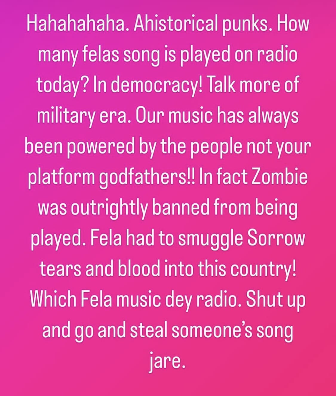 Hahahahaha. Ahistorical punks. How many felas song is played on radio today? In democracy! Talk more of military era. Our music has always been powered by the people not your platform godfathers!! In fact Zombie was outrightly banned from being played. Fela had to smuggle Sorrow tears and blood into this country!