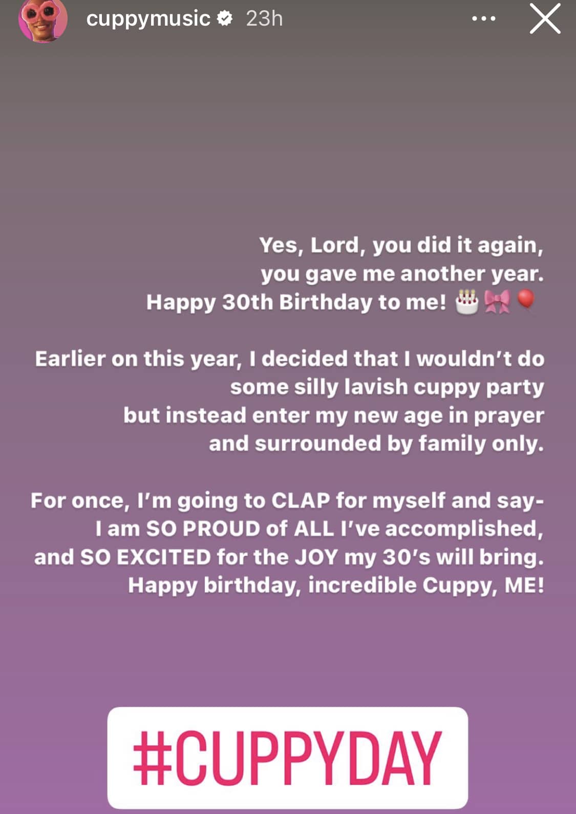 Cuppy who recently celebrated her 30 year birthday anniversary on the 11th of November, had taken to her social media pages to express her joy at reaching a 3rd decade of life.